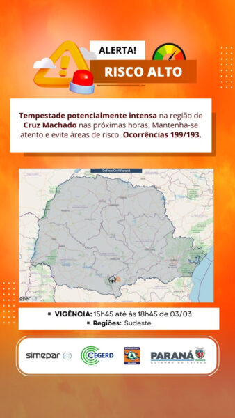 A Defesa Civil do Paraná emitiu, nesta terça-feira, 3, um alerta de risco alto para tempestade potencialmente intensa na região de Cruz Machado, no Sudeste do Estado. O aviso tem vigência das 15h45 às 18h45.