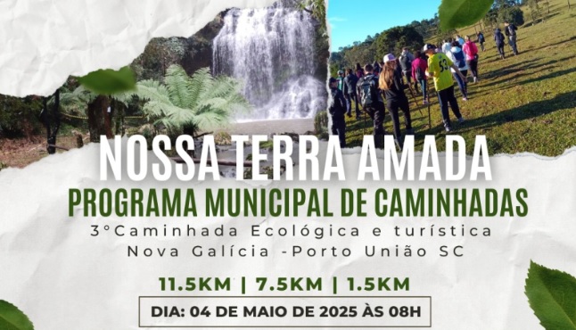 A Prefeitura de Porto União, por meio da Secretaria de Cultura e Turismo, está organizando a 3ª Caminhada Ecológica e Turística de Nova Galícia. Coordenado por Bruna Werle, o evento acontecerá no dia 4 de maio de 2025, das 7h30 às 13h, proporcionando uma experiência única de contato com a natureza e prática esportiva.