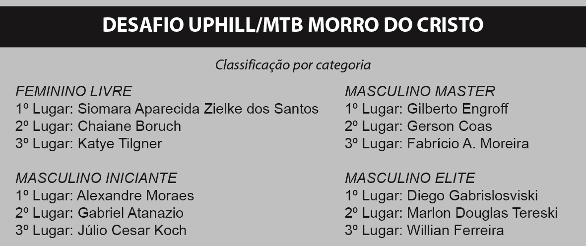 A Secretaria de Esportes de União da Vitória promoveu no domingo, 7, o Desafio Uphill/MTB Morro do Cristo. A competição era disputada em largadas individuais e os atletas que obtivessem o melhor tempo no percurso definiam os campeões em todas as categorias.