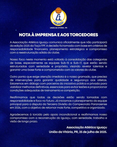 A Associação Atlética Iguaçu comunicou oficialmente nessa sexta-feira, 25, que não participará da Taça FPF 2025. A decisão foi baseada em critérios de responsabilidade financeira, planejamento estratégico e no compromisso com a reestruturação do clube.