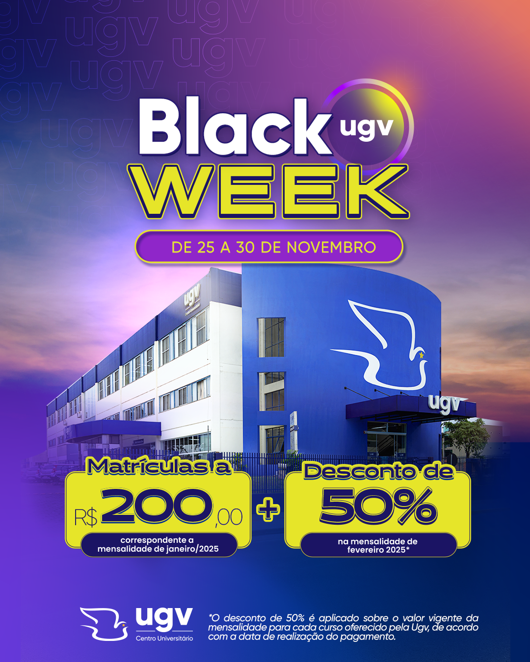 A UGV – Centro Universitário, reconhecida por sua excelência e avaliada com nota máxima (5) pelo Ministério da Educação (MEC), preparou uma oportunidade única para quem quer investir no futuro. De 25 a 30 de novembro, acontece a Black Week UGV, com o maior desconto do ano para calouros de 2025.