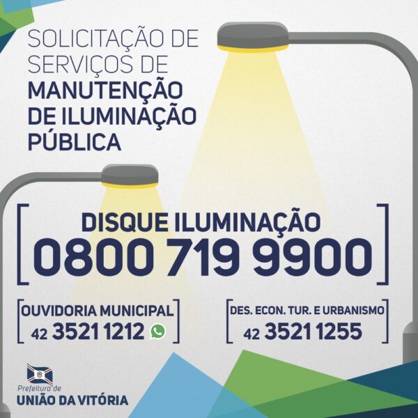 O serviço de troca de lâmpadas queimadas nos postes de União da Vitória pode ser solicitado por diversos meios, um deles é pelo número 0800 719 9900. O cidadão também pode solicitar o serviço pelo telefone/whatsapp da Ouvidoria Municipal (42) 3521-1212 e pelo telefone da Secretaria Municipal de Desenvolvimento Econômico, Turismo e Urbanismo de União da Vitória (42) 3521-1255.