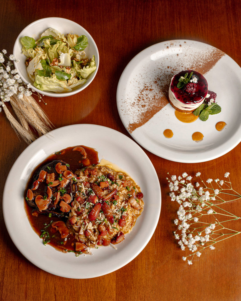 Prato Principal: Risoto cremoso de pinhão, acompanhado de escalopes de mignon ao molho madeira clássico, encorpado e aromático.