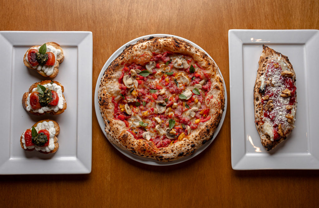 Prato Principal: Pizza Napoletana Colonial, com massa fermentação natural (48h), molho pomodoro, queijo colonial, linguiça Blumenau, mix de pimentões, champignon e manjericão.