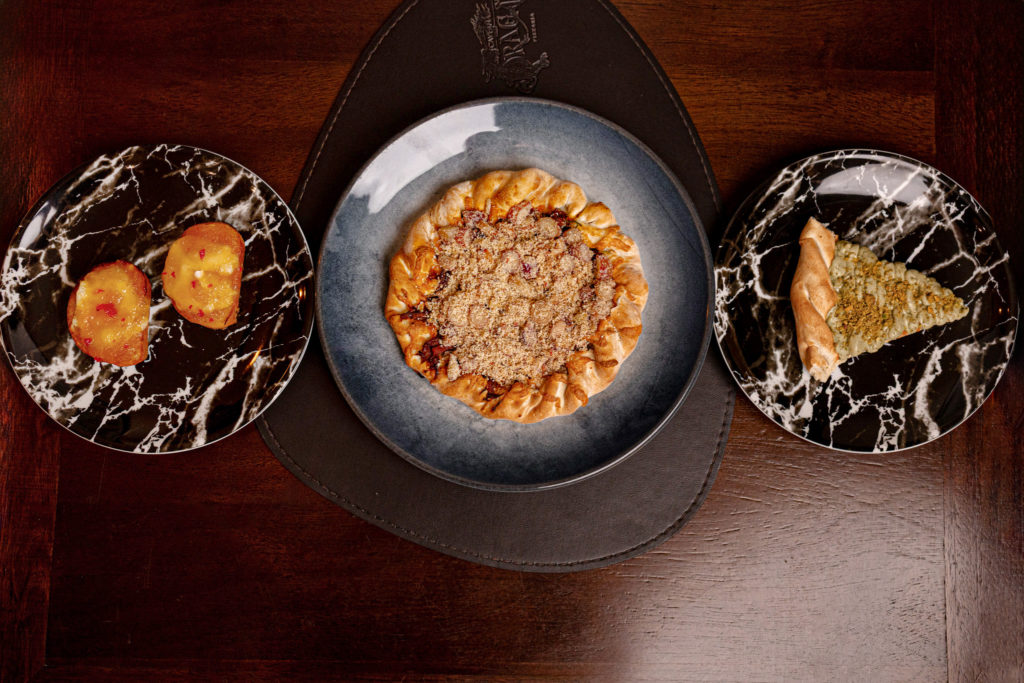 Entrada: Pão mineiro com queijo Brie e geléia de abacaxi com pimenta artesanal gratinada.