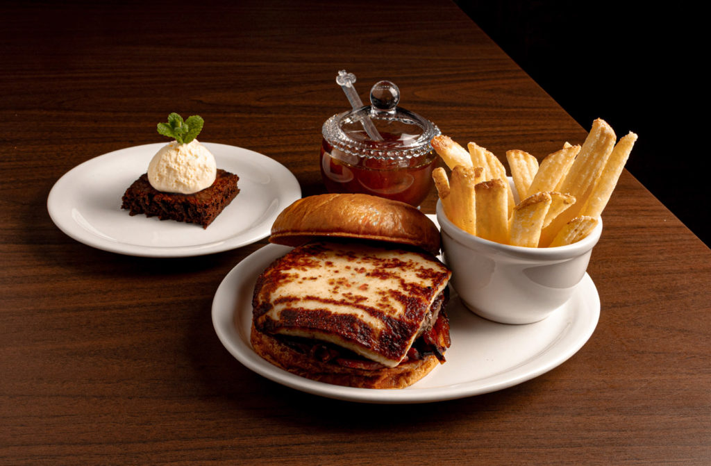 Prato Principal: Burger de 180g na parrilla com cebola grelhada no pão especial com maionese, servido ao meio em frigideira e mergulhado em uma fonduta de queijo colonial.