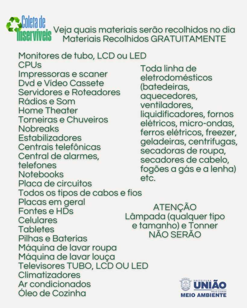 A orientação para quem deseja descartar esses equipamentos é verificar quais estão obsoletos ou não funcionam mais, desde fones de ouvido até televisores, e levá-los aos locais de recolhimento. A entrega dos materiais no ponto de coleta é gratuita. Lâmpadas e tonners não serão recolhidos. “É uma oportunidade para os munícipes estarem destinando corretamente esses produtos eletrônicos e dessa forma evitar o descarte em locais inapropriados”, destaca o secretário de Meio Ambiente de União da Vitória, Nei Kukla.