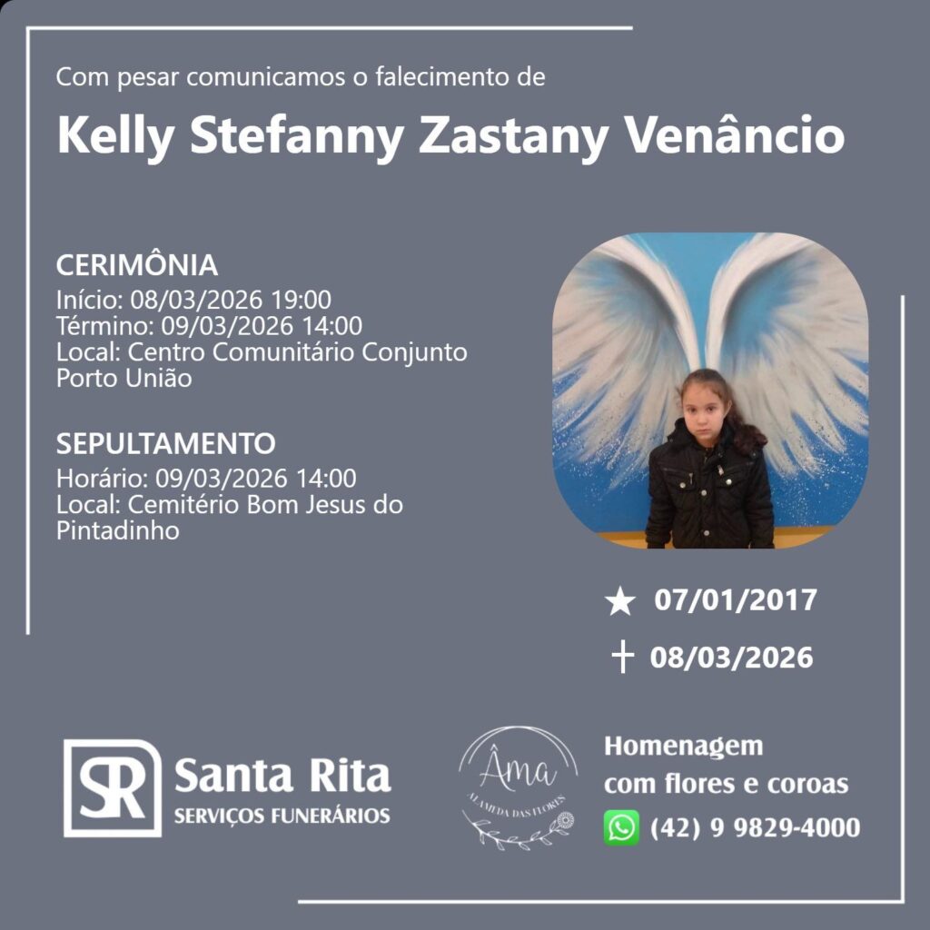 A Prefeitura de Porto União divulgou uma nota oficial de pesar lamentando o falecimento precoce da estudante do Núcleo Educacional São Bernardo do Campo.