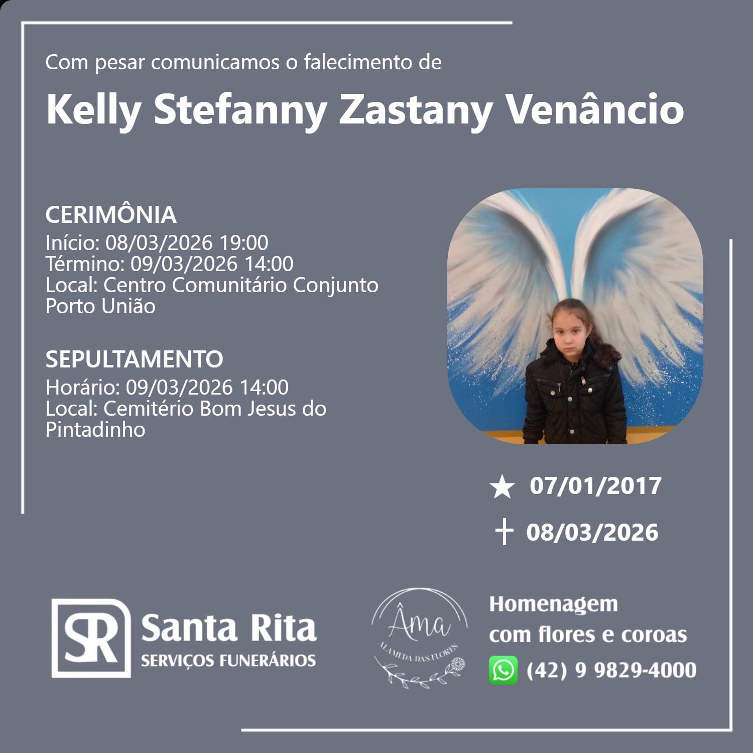 Segundo informações divulgadas pelos serviços funerários, o velório ocorre no Centro Comunitário Conjunto Porto União, como término previsto para 14h de segunda-feira, 09.