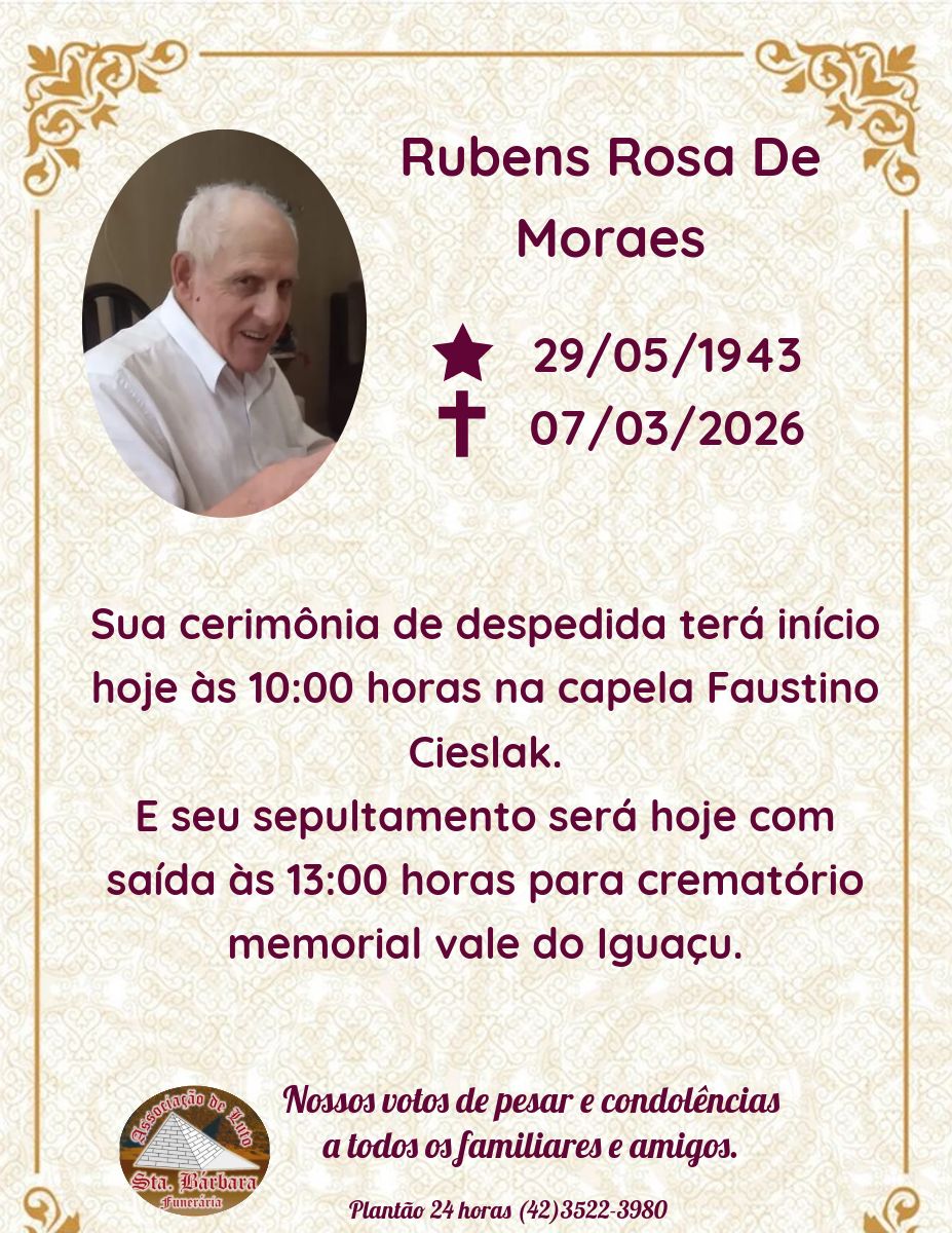 O centro de União da Vitória amanheceu mais silencioso com a notícia do falecimento de Rubens Rosa de Moraes, aos 82 anos. Conhecido por sua presença constante e sorriso no rosto, “Seu Rubens” era uma figura emblemática para quem circulava diariamente pela região central da cidade.