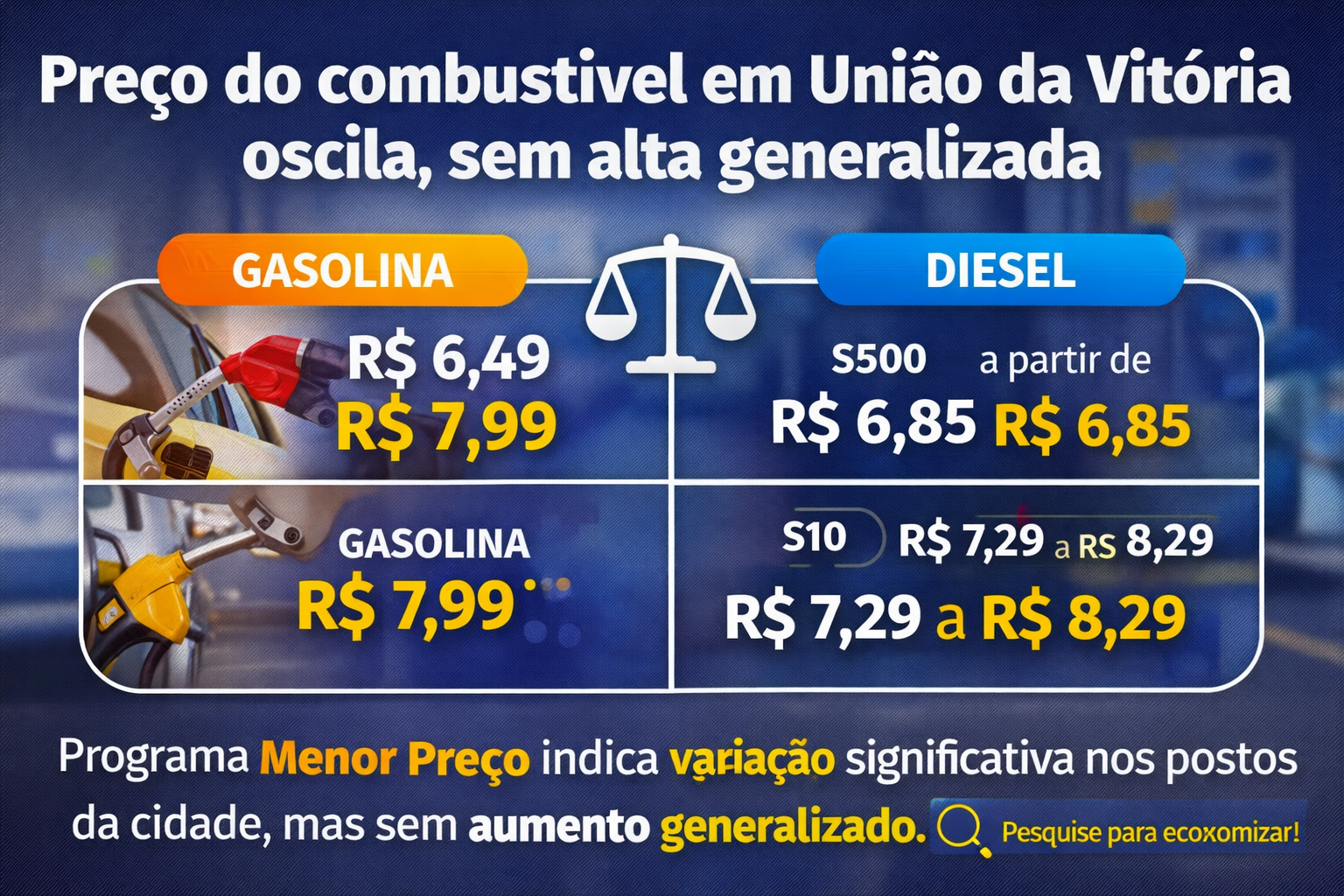 O preço do combustível em União da Vitória para o diesel tipo S500 aparece com valores a partir de R$ 6,85, enquanto o diesel S10 varia, em média, entre R$ 7,29 e R$ 8,29, dependendo do posto e do tipo do produto.