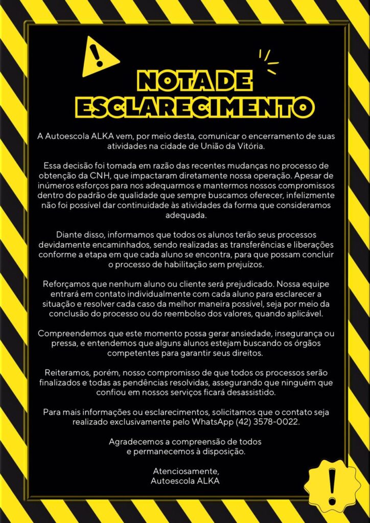 Após a publicação da reportagem, a Autoescola Alka encaminhou nota oficial à redação informando o encerramento das atividades em União da Vitória.
