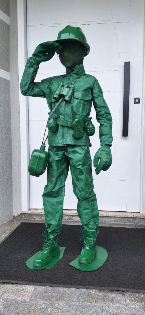 “Conversei com ele e pensei que muitos iriam vestidos dos personagens principais. Então tive a ideia de fazer algo diferente, o soldadinho. Pesquisei como montar, fui atrás de acessórios, tinta e muita paciência. Enfim, ficou do jeitinho que eu queria”, contou a mãe.
