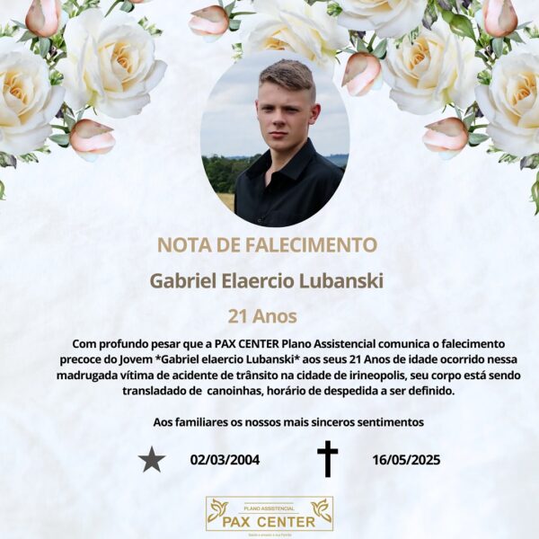 A Funerária Pax Center informou que o corpo do jovem Gabriel Elaercio Lubanski, de 21 anos, será transladado para Mallet e será velado na Capela Mortuária Municipal, a partir das 19 horas desta sexta-feira, 16. Sepultamento com horário e local a serem marcados.