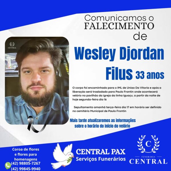 Foi identificado como Wesley Djordan Filus o homem encontrado sem vida dentro de um carro na manhã desta segunda-feira, 16, em São Mateus do Sul. Natural de Paulo Frontin, o professor será transladado para sua cidade natal, onde familiares e amigos realizam as últimas homenagens.