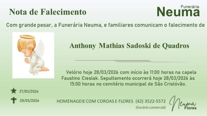 Anthony Mathias Sadoski de Quadros 29/03/2026 - 10h24 · Atualizado há 5 horas Sugira uma correção Fique sempre atualizado Entre no nosso grupo do WhatsApp e siga nosso perfil no Instagram para não perder nenhuma notícia! Grupo do WhatsApp Instagram