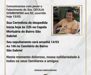 Cecilia Gombowski 14/03/2025 - 14h25 · Atualizado há 12 meses FALECIMENTO: Cecilia Gombowski ★1943 ✞ 13/03/2025 VELÓRIO: Capela Mortuária do Bairro São Gabriel SEPULTAMENTO: 16H do dia 14/03, no cemitério do Bairro São Gabriel. Sugira uma correção