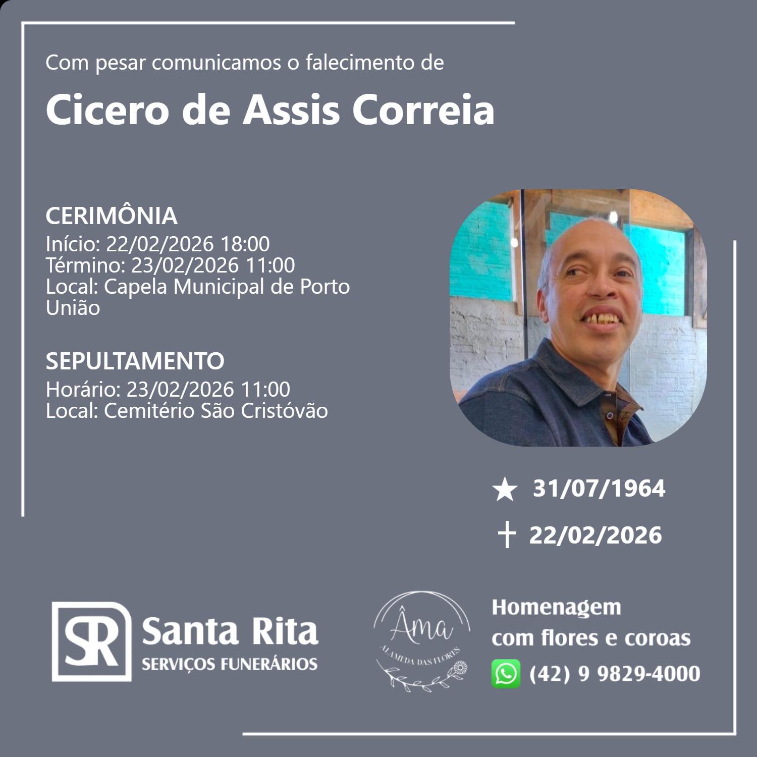 Cicero de Assis Correia 22/02/2026 - 19h36 · Atualizado há 1 semana Cicero de Assis Correia. Sugira uma correção