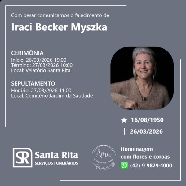 Iraci Becker Myszka 27/03/2026 - 10h32 · Atualizado há 5 horas Sugira uma correção Fique sempre atualizado Entre no nosso grupo do WhatsApp e siga nosso perfil no Instagram para não perder nenhuma notícia! Grupo do WhatsApp Instagram