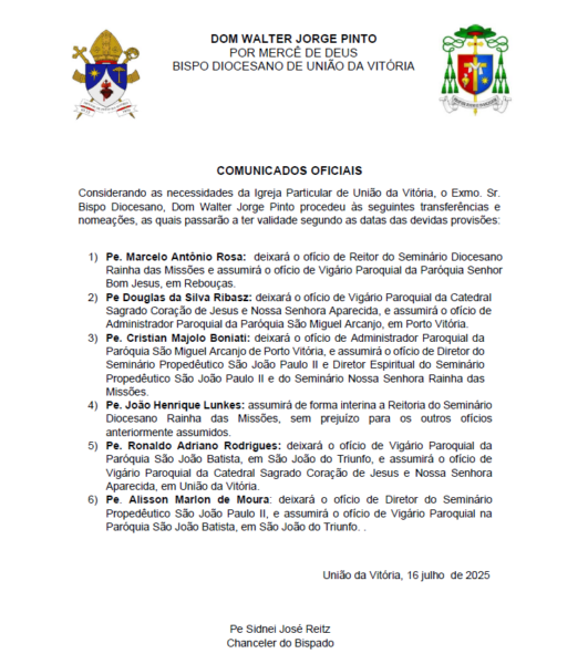 Na tarde desta quarta-feira, 16 de julho, o Exmo. Sr. Bispo Diocesano de União da Vitória, Dom Walter Jorge Pinto, comunicou as transferências e nomeações do clero da Diocese, atendendo às necessidades da Igreja Particular local. Alguns sacerdotes foram transferidos entre paróquias, enquanto outros receberam novas designações para diferentes funções.