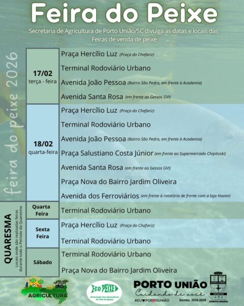 A Prefeitura de Porto União, por meio da Secretaria de Agricultura, divulgou as datas e os locais das Feiras do Peixe que serão realizadas no município, ampliando o acesso da população a produtos frescos e de qualidade durante o período da Quaresma.