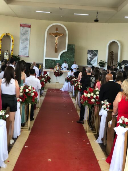 A igreja ficou repleta de familiares e amigos que testemunharam os noivos oficializarem seus laços matrimoniais. A cerimônia foi marcada pela alegria e pela importância do sacramento para as famílias envolvidas.