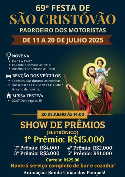 A tradicional Festa de São Cristóvão, padroeiro dos motoristas, chega à sua 69ª edição em 2025 e já está movimentando a cidade de União da Vitória. As novenas começaram no dia 11 de julho e seguem até dia 19.