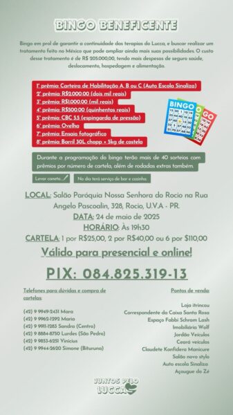 Para arrecadar fundos, amigos e familiares estão organizando um bingo beneficente, que será realizado no próximo dia 24 de maio de 2025, às 19h30, no pavilhão da Igreja do bairro Rocio, em União da Vitória.