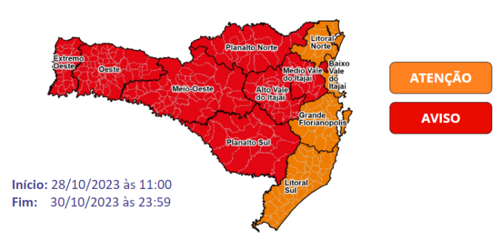 No período de sábado (28) a domingo (29), o risco é ALTO para movimentações de terra nas regiões do Litoral Norte, Litoral Sul, Baixo Vale do Itajaí e Grande Florianópolis e MUITO ALTO para para as regiões do Grande Oeste, Planalto Norte, Planalto Sul e as regiões do Alto e Médio Vale do Itajaí.