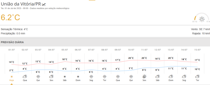 A madrugada desta terça-feira, 1, foi marcada por registros de frio intenso, especialmente no Sul paranaense. No distrito de Horizonte, em Palmas, os termômetros marcaram impressionantes -1,9°C, com sensação térmica de -7,6°C, de acordo com o Simepar (Sistema de Tecnologia e Monitoramento Ambiental do Paraná).