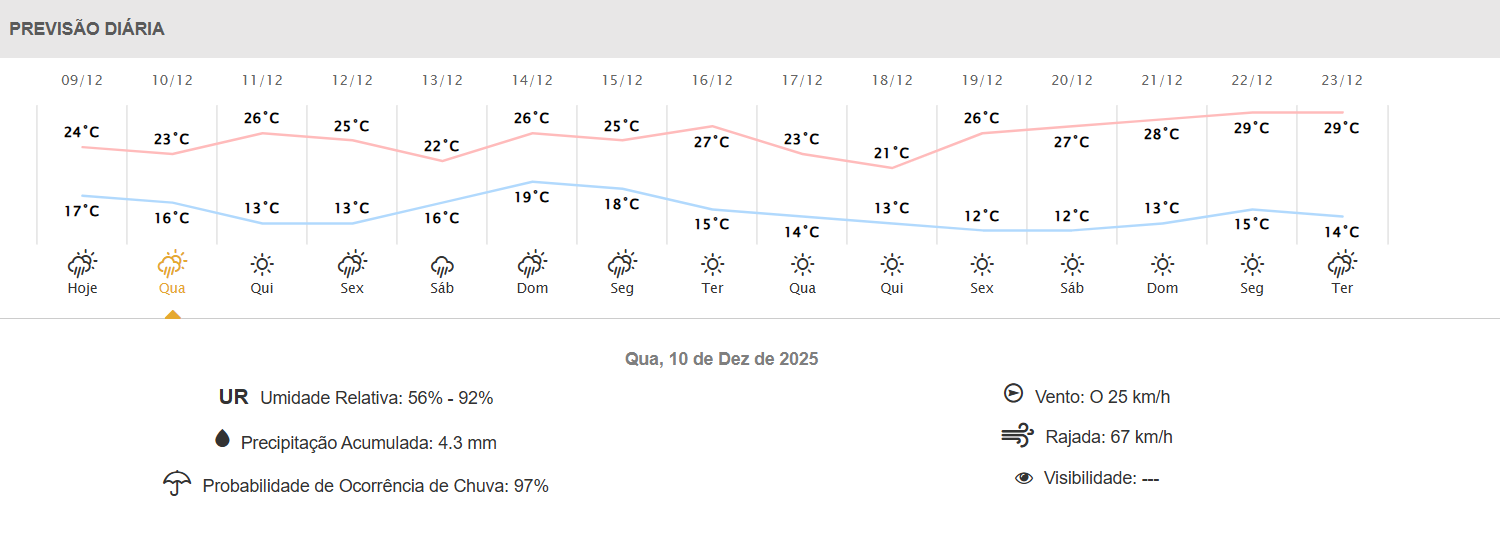 Campos Gerais e RMC: 24°C em Ponta Grossa e 23°C em Curitiba.
