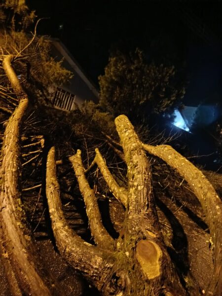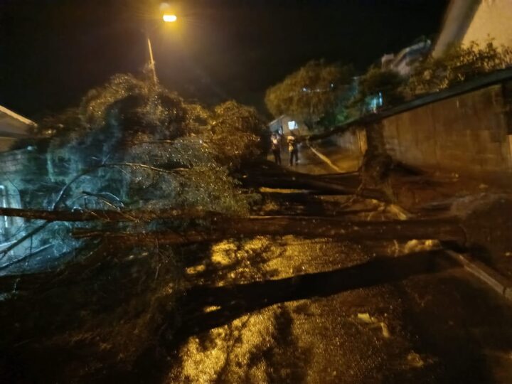A ventania foi um dos pontos mais críticos da ocorrência, derrubando árvores inteiras que bloquearam ruas, gerando risco imediato para motoristas e pedestres.