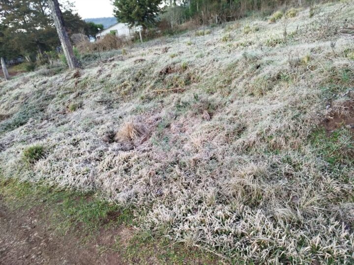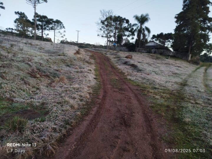 O amanhecer gelado manteve a paisagem coberta por uma fina camada de geada, especialmente nas regiões rurais, cenário que já se tornou comum nos últimos dias de inverno. Como foi o caso da localidade de Palmital de Cima interior de União da Vitória.