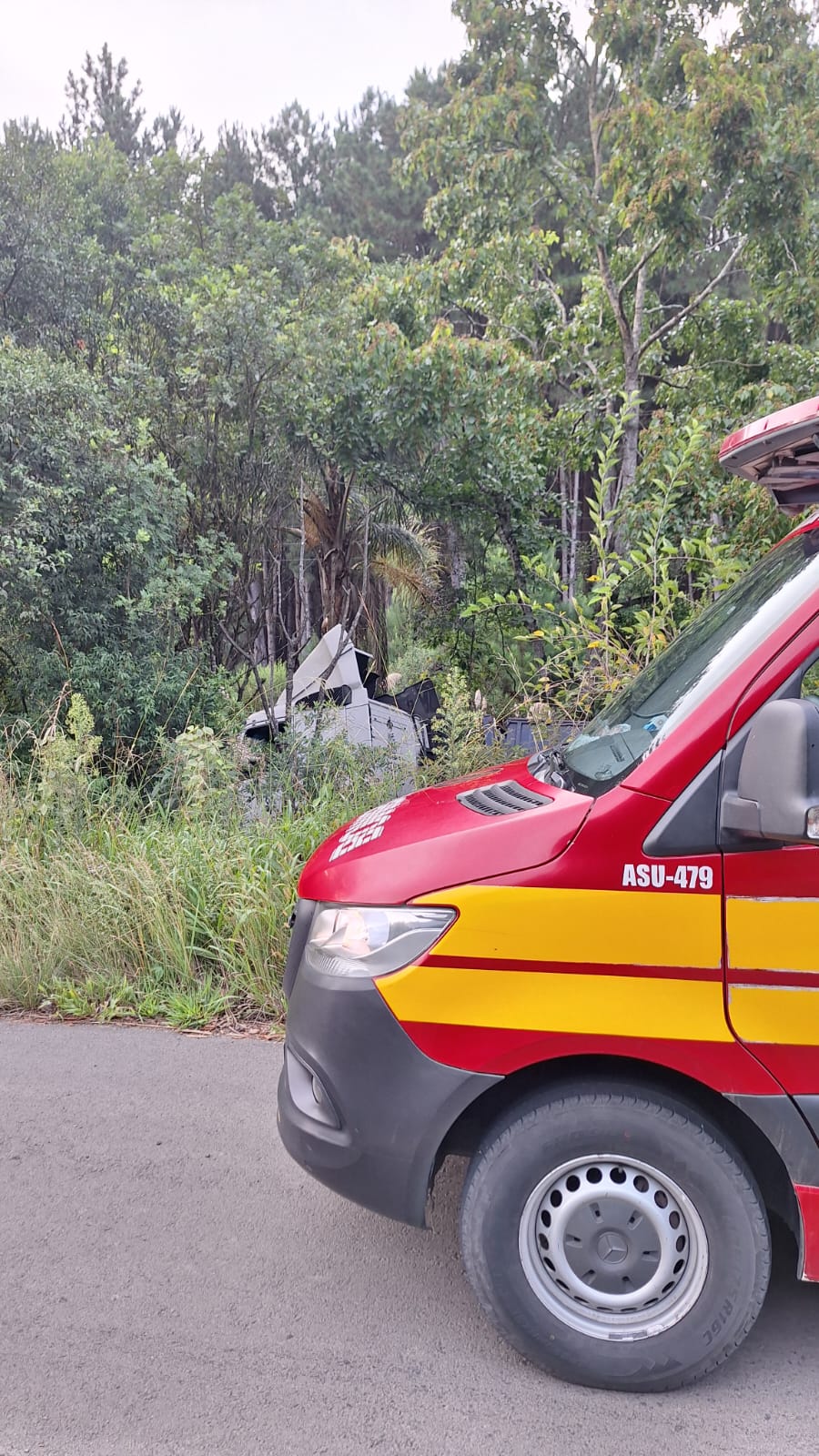 No local, os socorristas constataram que um caminhão Volvo FH12 havia saído da pista. O motorista, um homem de 44 anos, foi encontrado consciente, orientado e caminhando pela cena do acidente.