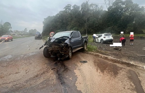 A colisão frontal envolveu um Jeep Renegade branco, com placas de Minas Gerais, e uma Toyota Hilux de Bituruna.