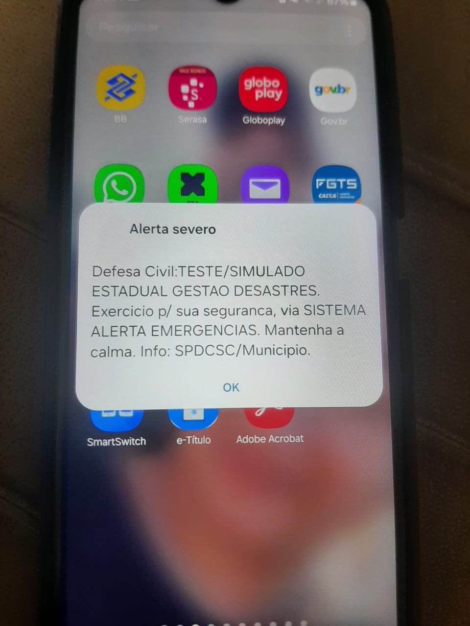 De acordo com autoridades, o aviso não está relacionado a nenhum desastre real, mas integra um simulado de gestão de desastres realizado neste domingo, 1, em Santa Catarina.