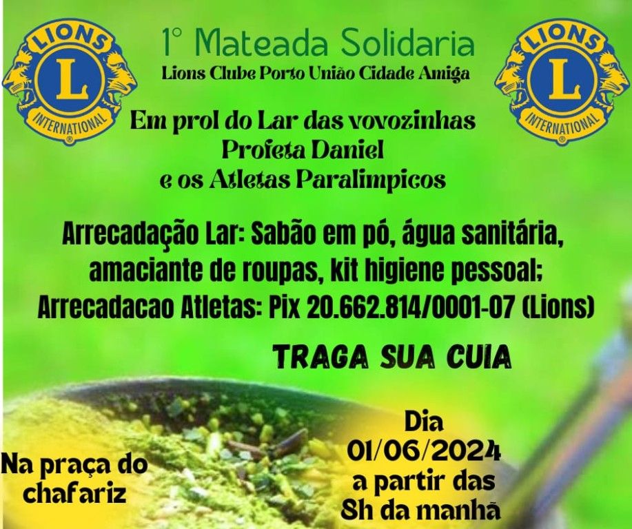Acontece neste sábado, 1, a 1ª Mateada Solidária do Lions Clube Porto União Cidade Amiga, em prol do Lar das Vovozinhas Profeta Daniel e os Atletas Paralímpicos.