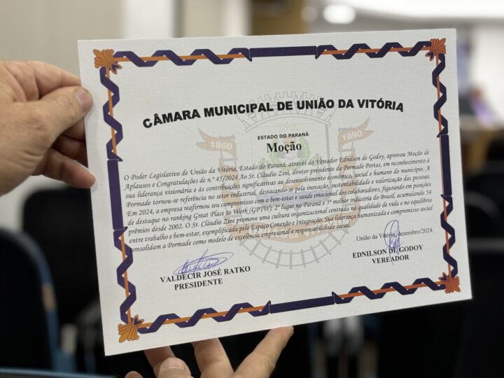Nesta segunda-feira, 16, a Câmara de Vereadores de União da Vitória homenageou Cláudio Zini, diretor-presidente da Pormade, com uma Moção de Aplausos.