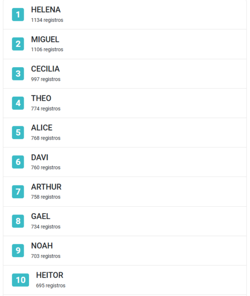 Em 2024, o nome feminino ultrapassou Miguel, que liderou os registros nos últimos quatro anos e agora ocupa a segunda posição.