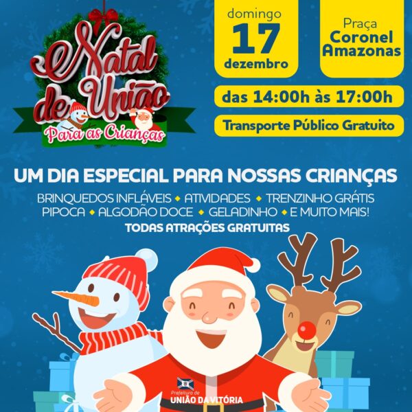 No próximo domingo, 17, a Praça Coronel Amazonas será o palco do Natal da União para as Crianças 2023, o evento acontece das 14 horas às 17 horas. Com várias atividades gratuitas preparadas pela Administração Municipal de União da Vitória, como: Passeios de Trenzinho de Natal, Brinquedos Infláveis, diversas brincadeiras, pipoca, algodão doce, geladinho, entre outras atividades.