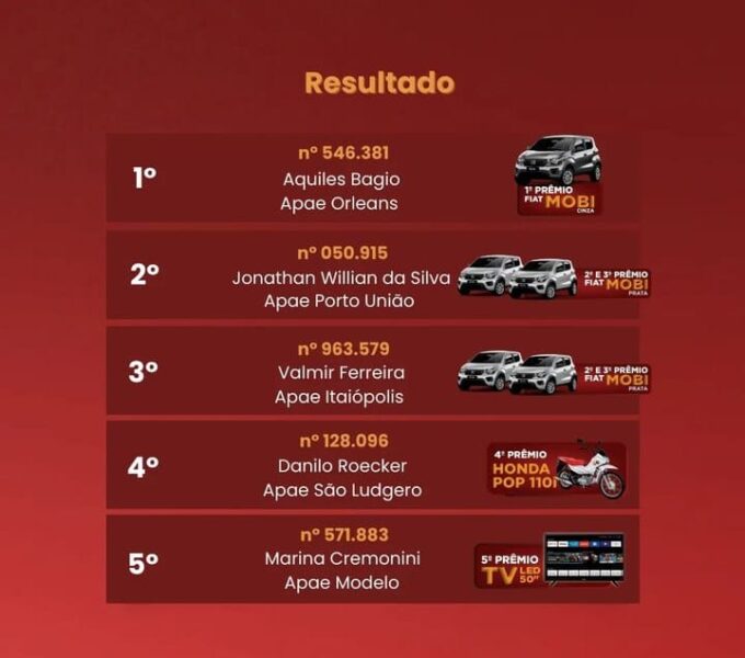 A Federação das APAEs do Estado de Santa Catarina, divulgou oficial, o resultado do Show de Prêmios de 2022, que teve o seu sorteio realizado na noite de sexta-feira, 23 de dezembro, pela Loteria Federal. E pela primeira vez a APAE de Porto União, tem um ganhador, sendo Jonathan Willian da Silva, que ganhou um veículo Fiat Mobi prata 0Km.